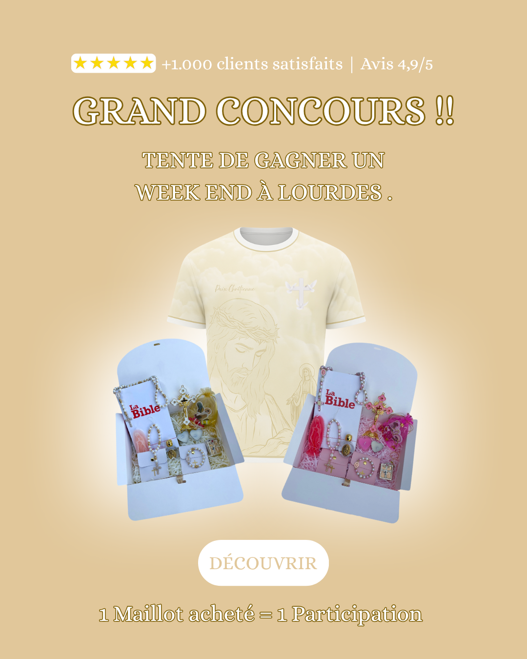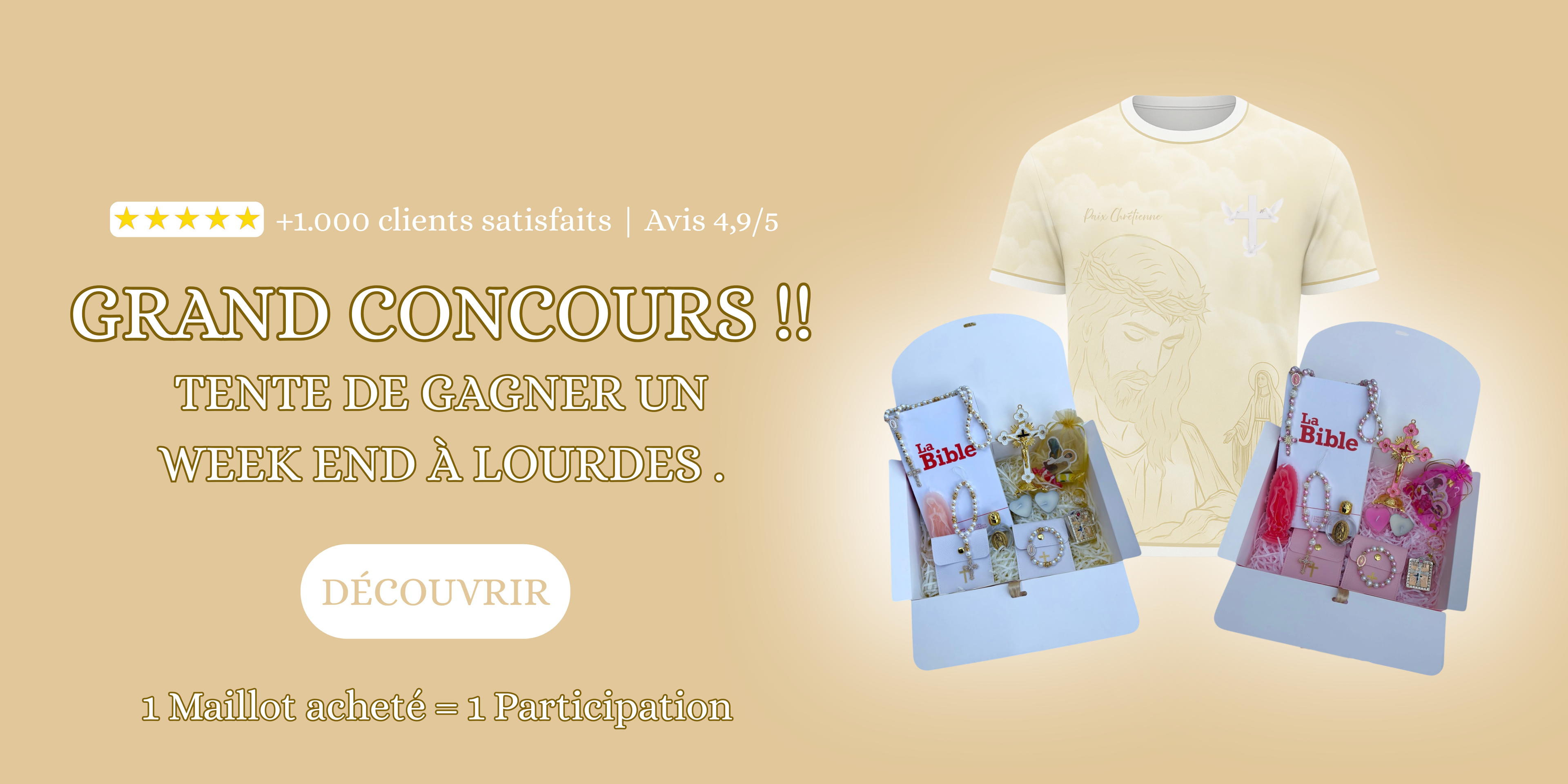 Participe en achetant un maillot au Grand Jeu Concours pour tenter de gagner un Week-end 3 jours et 2 nuits au magnifique Sanctuaire de Lourdes.